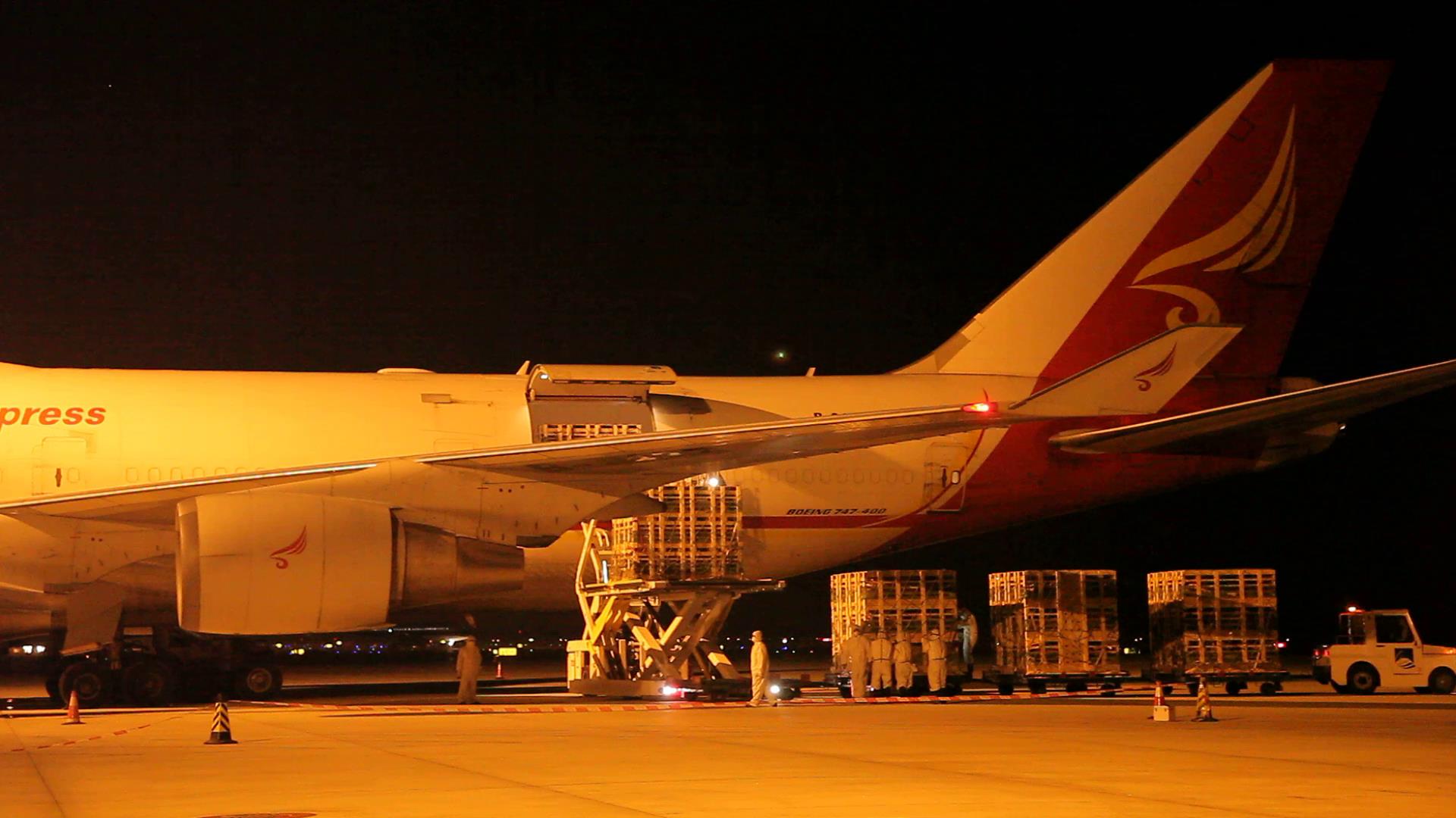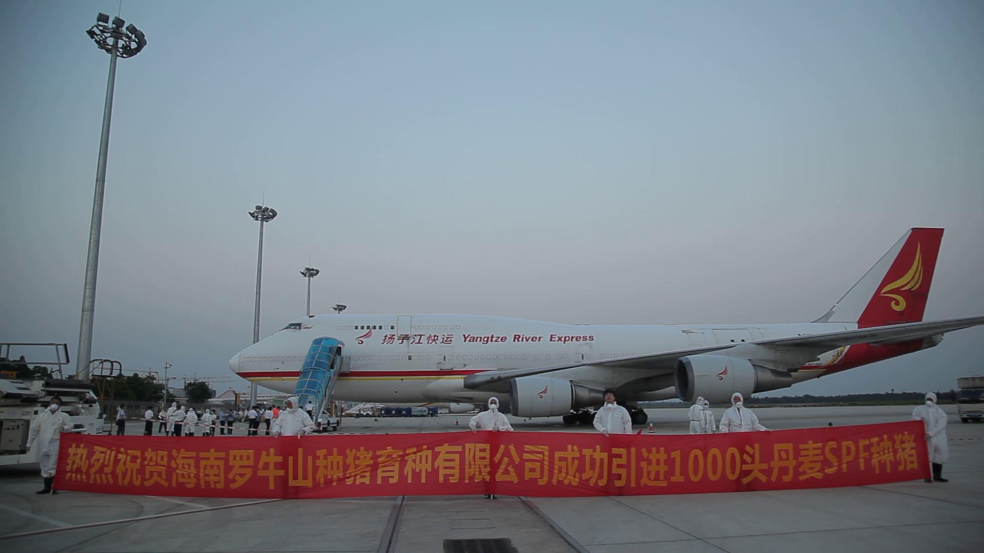 北京時(shí)間2016 年 4 月 25 日下午18時(shí)35分,1000頭丹麥SPF種豬乘坐揚(yáng)子江貨運(yùn)B747貨機(jī)航班,順利降落??诿捞m機(jī)場(chǎng)。整機(jī)共22塊三層豬籠,共運(yùn)載種豬約1000頭。此批SPF原種豬,是羅牛山公司為即將投產(chǎn)的羅牛山十萬頭現(xiàn)代化豬場(chǎng)專門引進(jìn)的第一批種豬。