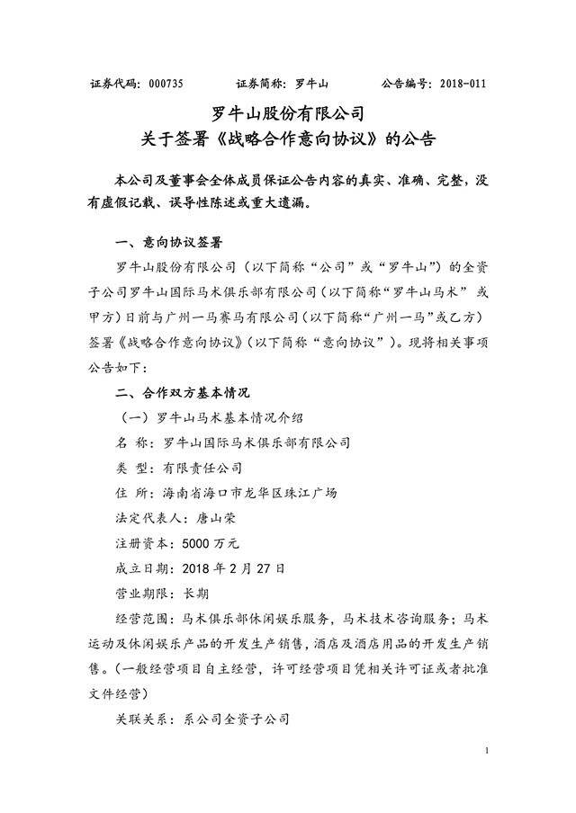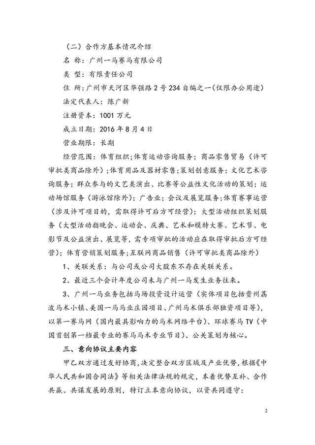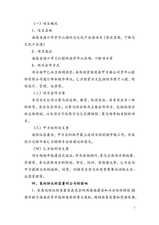 公司全資子公司羅牛山國際馬術俱樂部有限公司日前與廣州一馬賽馬有限公司簽署《戰(zhàn)略合作意向協(xié)議》。雙方擬共同投資建設海南省??谑辛_牛山國際馬文化產業(yè)園項目。項目選址為海南省??谑腥?zhèn)西南羅牛山農場、118項目等。