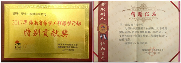 儀式上,羅牛山股份有限公司等7家單位被授予“2017年海南省希望工程圓夢行動特別貢獻(xiàn)獎(jiǎng)”,自2015年至今,羅牛山在海南省希望工程圓夢行動中累計(jì)捐款242萬元。