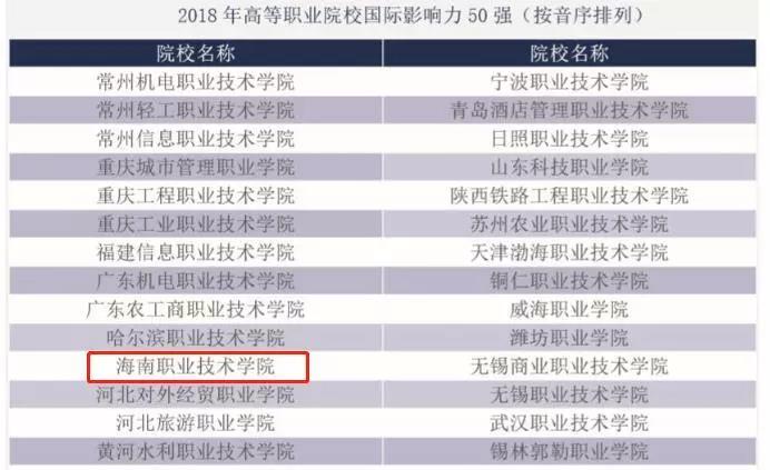 6月20日,《2019中國高等職業(yè)教育質(zhì)量年度報告》發(fā)布會在北京隆重召開。海南職業(yè)技術(shù)學(xué)院榮膺“全國高職院校2018年國際影響力50強”。這是海職院連續(xù)三次榮登該榜單,也是海南省唯一連續(xù)三次榮登該榜單的高職院校,同時也是本年度報告中發(fā)布的“育人成效”、“教學(xué)資源”、“國際影響力”和“服務(wù)貢獻”四個50強榜單中唯一上榜的海南高職院校。