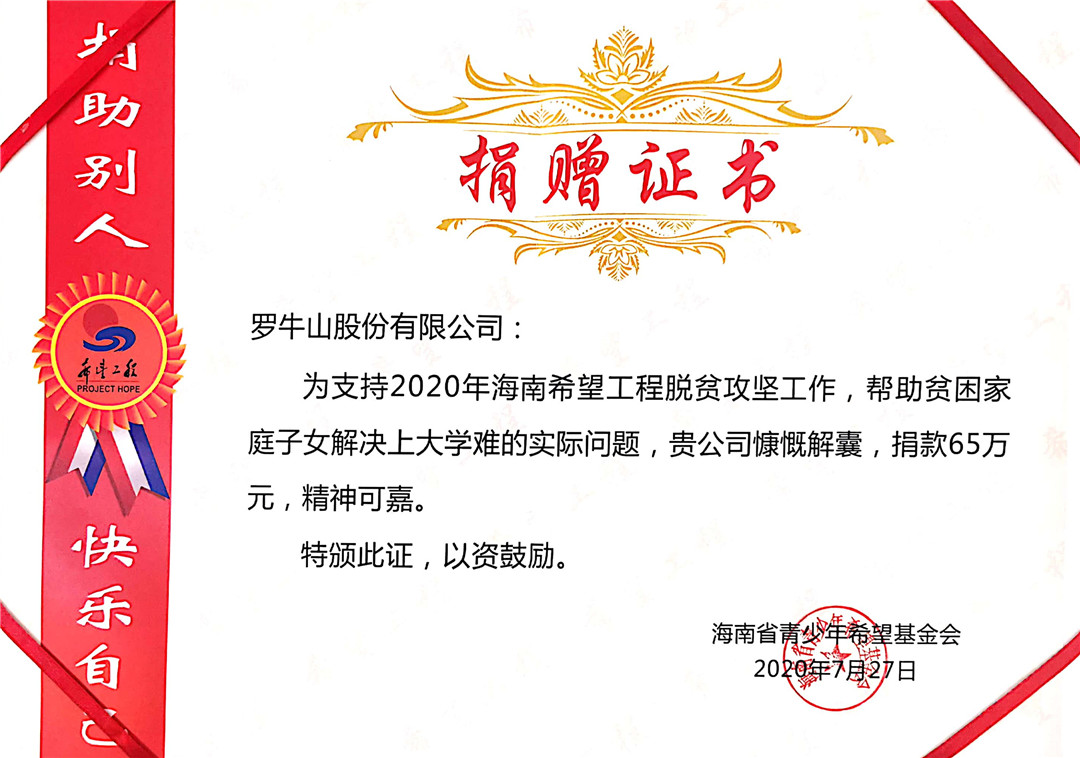 7月27日下午,2020年海南省希望工程圓夢行動(dòng)表彰暨啟動(dòng)儀式在??谂e行。儀式現(xiàn)場,羅牛山股份有限公司被授予“2019年度海南省希望工程脫貧攻堅(jiān)特別貢獻(xiàn)獎(jiǎng)”。同時(shí),為了支持2020年海南省希望工程脫貧攻堅(jiān)工作,幫助家庭貧困學(xué)子解決上大學(xué)難的實(shí)際問題,羅牛山股份有限公司現(xiàn)場捐贈(zèng)65萬元,持續(xù)助力海南省希望工程圓夢行動(dòng)這一惠民工程。