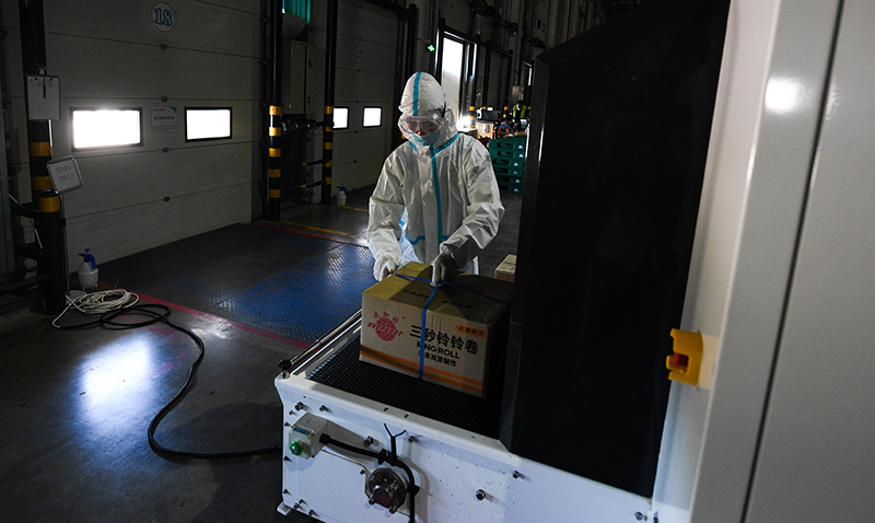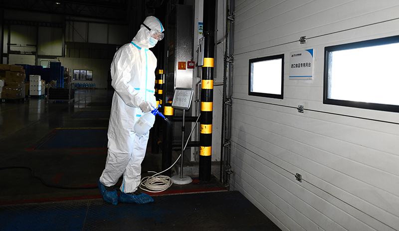 圖說:收發(fā)貨分揀區(qū)工作人員為進(jìn)口食品專用月臺消毒。