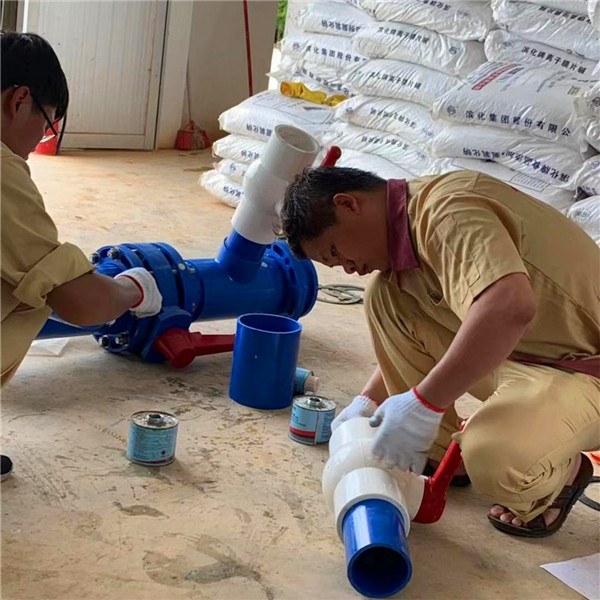 圖2:安全與設(shè)備管理部的小伙伴們正在用膠水對(duì)管道進(jìn)行連接,施工過(guò)程中突然下起雨,為保證膠水粘黏效果,他們撐起傘遮住管道連接處,全然不顧自己被雨水淋濕。
