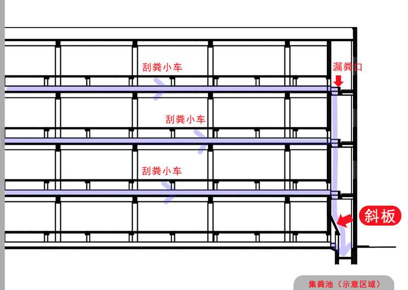 高層樓房養(yǎng)殖,各層豬只產(chǎn)生的糞便,通過刮糞小車定向刮往一級糞溝末端,豬糞從高層漏糞口自由落體式下落,最終由二級糞溝刮糞小車刮入末端集糞池中。