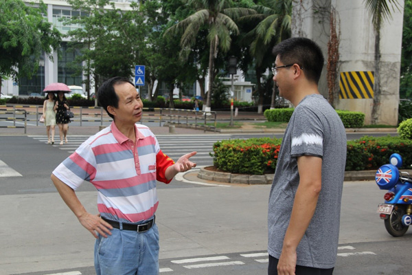 海口市委統(tǒng)戰(zhàn)部副部長(zhǎng)唐火根在現(xiàn)場(chǎng)與羅牛山股份有限公司總助唐山榮交談,對(duì)羅牛山號(hào)召500人隊(duì)伍前來(lái)表示贊許。