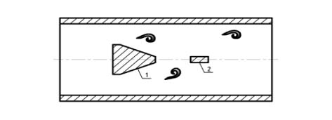 在流體中設(shè)置非流線型旋渦發(fā)生體(阻流體),則從旋渦發(fā)生體兩側(cè)交替地產(chǎn)生兩列有規(guī)則的旋渦,這種旋渦稱為卡曼渦街,如下圖所示。