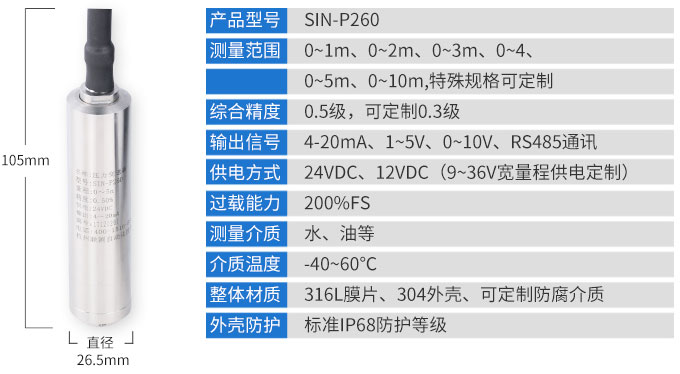 SIN-P260投入式液位變送器由高性能擴(kuò)散硅壓阻式壓力傳感器作為測(cè)量元件,把與液位深度成正比的液體靜壓力準(zhǔn)確測(cè)量出來(lái)...…