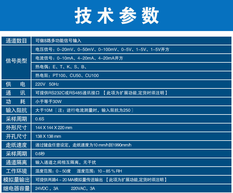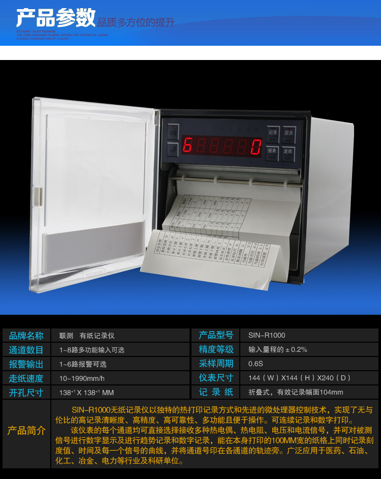 SIN-R1000有紙溫度記錄儀最多具有8路輸入通道,2路模擬量輸出,通道之間采用點點隔離;均可直接選擇接收多種熱電偶、熱電阻、壓力變送器、電壓、電流信號,并可對被測信號進行數(shù)字顯示及進行趨勢記錄和數(shù)字記錄,能在本身打印的120mm寬的紙格上同時記錄刻度值、時間及每一個信號的曲線,并將通道號印在各通道的軌跡旁。打印記錄功能采用進口固定式熱敏頭,無筆墨消耗,無筆位誤差,抗震動。